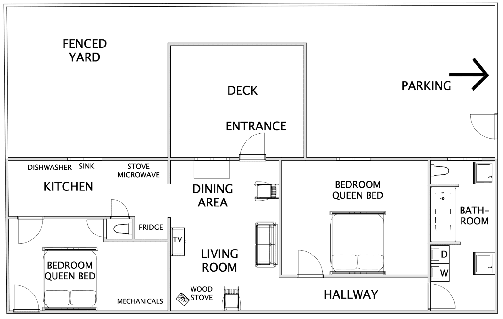 - Two bedrooms, each has a queen bed